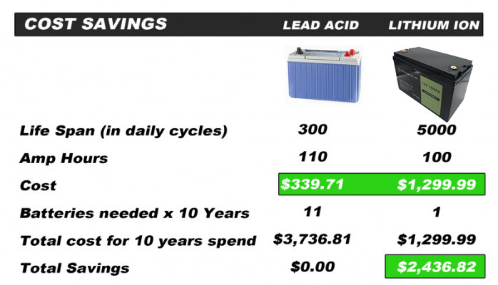LifePO4 batteries are between 1/3-1/4 the weight of traditional lead acid batteries, making them a more sensible lightweight solution. They also cycle up to 10,000 times, whereas lead acid batteries cycle only 300-500 times before failing.